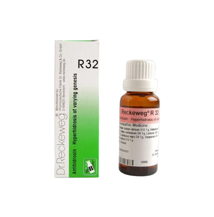 Homeopathic Dr. Reckeweg R32 Prescription drops minimize excessive perspiration and body warmth. This medicine treats acne, irregular perspiration, and nocturnal sweating. It also treats STDs. Shoulder blade fatigue and weakness are reduced.