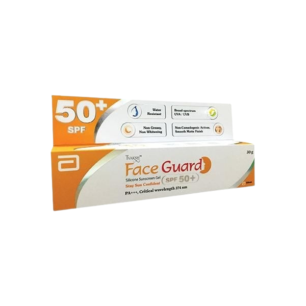Tvaksh Face Guard is a sunscreen gel containing Silicone as an active ingredient and helps to protect skin from harmful rays and tanning. It is a potent formulation that provides effective protection from harmful UVA and UVB sun rays and reduces dark spots, darkening, and other skin blemishes while helping you retain a youthful appearance.