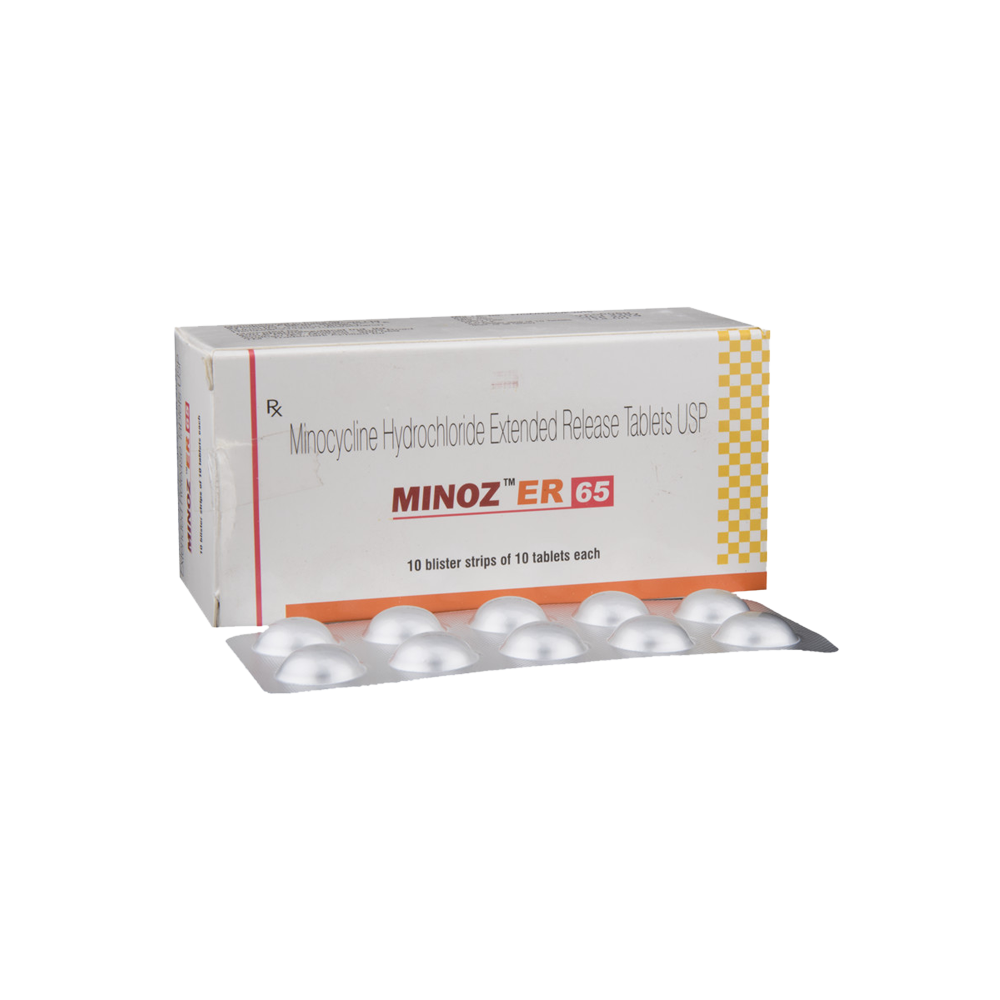 Minoz ER 65 mg Tablet is a medication used to treat various bacterial infections. It contains minocycline hydrochloride, which is an antibiotic product that works by putting an end to the growth of bacteria. It is important to take this medication as prescribed by a doctor and to complete the full course of treatment to ensure that the infection is fully treated.
