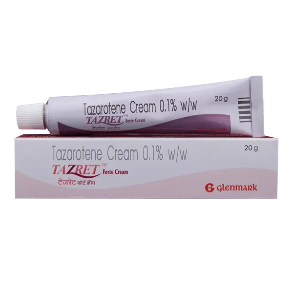 Tazarotene cream 0.1 20gm is a topical treatment for plaque psoriasis in adults and adolescents. It helps decrease skin inflammation and skin changes associated with psoriasis. Tazarotene, the active ingredient of the medicine reduces itching, skin cracking, and redness associated with this autoimmune disorder. The cream is also used to treat different skin problems such as acne, wrinkles, fine lines, and crows feet on the face. Tazret forte cream is an effective treatment for acne vulgaris, preventing the formation of whiteheads, blackheads and pimples.