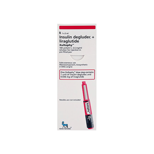 Pens are pre-filled with Liraglutide (3.6 mg/1 ml) and Insulin Degludec (100 IU) by Xultophy. Both medications are in the pen. Liraglutide reduces blood glucose by boosting insulin production, lowering glucagon release, and prolonging stomach emptying—slow digestion of liraglutide. Basal insulin Degludec lasts—a 24-hour glucose-lowering agent. Drugs regulate fasting and post-meal blood sugar.